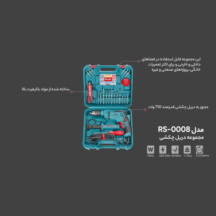 ویژگیهای دریل: سیستم گردش چپگرد , سیستم گردش راستگرد , قابلیت کنترل سرعت , قفل سوییچ , سیستم ضربه زن