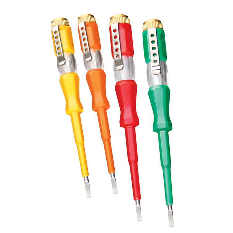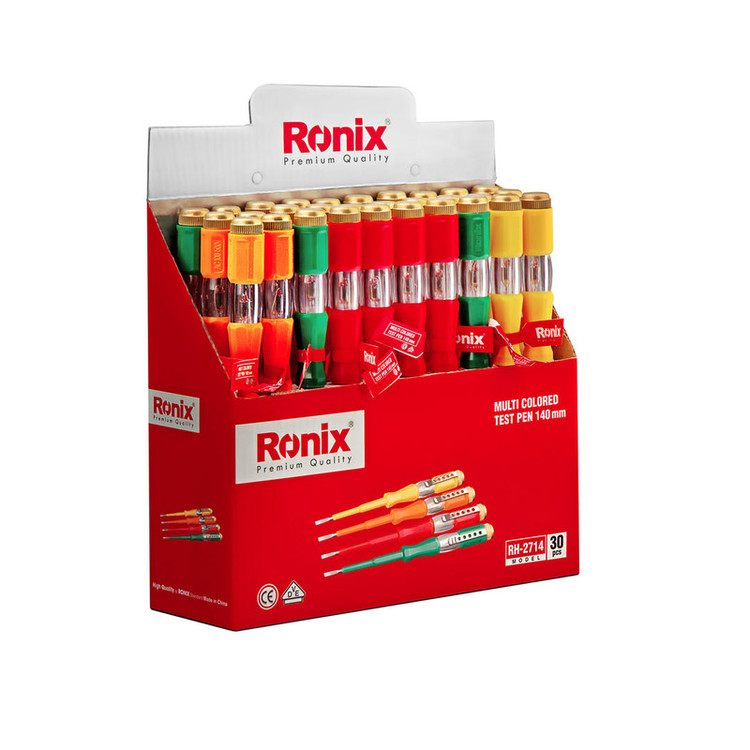 فازمتر رونیکس مدل RH-2714 یک فازمتر 14 سانتی متری دارای میله سخت کاری شده فولادی مقاوم در برابر ضربات است که نوک آن با فلز کروم آبکاری شده است. این فازمتر ، مجهز به لامپ نئون داخلی پر نور برای کار در روشنایی روز و محیط های پر نور است و امکان تعویض لامپ آن در صورت سوختن فراهم است. دسته پلاستیکی این فازمتر دوسو با پوشش ABS مرغوب و یکدست با طراحی ضدلغزش، در طول زمان کیفیت خود را حفظ میکند. پیچ این ابزار دستی که به صورت دوسو طراحی شده است، کاملا صیقلی و شفاف است و با کمک آن میتوان در محدوده ولتاژ 120 تا 250 ولت کار کرد. این فازمتر سبک 16 گرمی، در کشور چین و مطابق با استانداردهای BS، EN ، ASDN اروپا طراحی و تولید شده است.