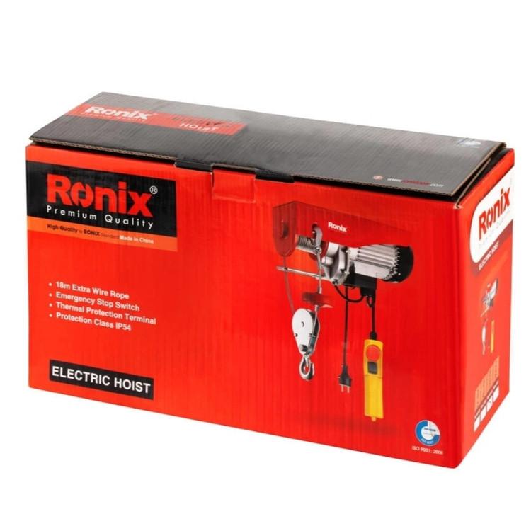 بالابر برقی رونیکس مدل RH-4135 دارای موتور پر قدرت با توان 1300 وات است که این موتور تولید شده تحت استاندارد CE اروپا و کلاس ایمنی IP54 می باشد. بدنه مقاوم این دستگاه از جنس استیل مقاوم بوده که مناسب استفاده در شرایط کاری سخت و دشوار است. این بالابر دارای ظرفیت تحمل بار 800 کیلوگرم در حالت دوبل و 400 کیلوگرم در وضعیت استاندارد است. برخورداری از سیم بکسل 18 متری فولادی از دیگر مشخصات این دستگاه است که در برابر پیچ خوردگی مقاومت بالایی دارد. این سیم بکسل فولادی توانایی بلند کردن اجسام تا 18 متر را در حالت استاندارد دارد که این مقدار در حالت دوبل حداکثر برابر با 9 متر است. از دیگر ویژگی های بالابر برقی 800 کیلویی RH-4135 می توان به سیستم قطع کن حرارتی جهت محافظت از موتور و جلوگیری از آسیب رسیدن به بالابر و نیز سیستم قطع کن اتوماتیک فوقانی اشاره کرد. در ضمن سرعت این ابزار برقی در حالت استاندارد 10 متر در دقیقه و در حالت دوبل برابر با 5 متر در دقیقه می باشد. این دستگاه در بسته بندی طراحی شده توسط رونیکس عرضه می شود.