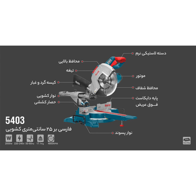 اره فارسی بر رونیکس 5403 یکی از قدرتمندترین ابزارهایی است که می توانید از آن در صنعت نجاری استفاده کنید.این فارسی بر به صورتی طراحی و تولید شده است که به کاربران خود این تضمین را می دهد تا بتوانند در نه زاویه متفاوت برش های دقیقی داشته باشند. از جمله مشخصات این اره فارسی بر آن است که قطعات آن را می توان به صورتی که مورد نیاز کاربر است تنظیم کرد. این امر باعث می شود که کاربر امکان آن را داشته باشد که بتواند به هر شکلی که نیاز دارد از ابزار استفاده کند. ازویژگی های اره فارسی بر رونیکس 5403 شاید در نگاه اول چندان مهم به نظر نرسد، ولی با توجه به قابلیت هایی که ابزار اره فارسی بر رونیکس 5403 دارد، اصلی ترین ویژگی آن که باید در نظر گرفت، طراحی جمع و جور و سبک آن است که باعث می شود بهتر بتوان آن را حمل و جابجا کرد. دسته D آن به صورت افقی و دسته حمل آن به صورت عمودی طراحی شده است که این امر به خاطر تناسب بهتر است و باعث می شود تا کاربر به صورت راحت تری بتواند آن را به کار بگیرد. از طرف دیگر دارای سیستمی است که می توان ابزار را بر روی میز قفل و تنظیم کرد. این سیستم به خاطر این به کار گرفته می شود که بتوان برای زوایای مختلف بتوان از سرعت و دقت بالایی بهره گرفت. همچنین سیستم قفل Spindle هم بر روی این ابزار وجود دارد که از آن برای تعویض راحت و سریع چرخ ها استفاده می شود. این سیستم امنیت کار را افزایش می دهد. سیستم جمع آوری گرد و غبار یکی دیگر از ویژگی های اصلی این اره فارسی بر است که بسیار کارآمد است و باعث می شود که کاربر سریع تر کار خود را پیش ببرد. توجه داشته باشید که این ابزار قدرتمند دارای سوییچی می باشد که ضد گرد و غبار است و باعث می شود تا گرد و غبار تا جای ممکن کمتر به آن نفوذ کند. معمولا به همراه این اره فارسی بر گیره ای است که برای ثابت نگه داشتن قطعه ای استفاده می شود که کاربر در حال کار بر روی آن است. یکی دیگر از ویژگی های مهم اره فارسی بر رونیکس، سیستم توقف و ترمز الکتریکی آن می باشد که باعث می شود ایمنی در کار حتما حفظ شود. این ترمز در مواقع لزوم برای ایمنی کاربر باعث می شود در لحظه تیغه از کار بیفتد و اره خاموش شود.