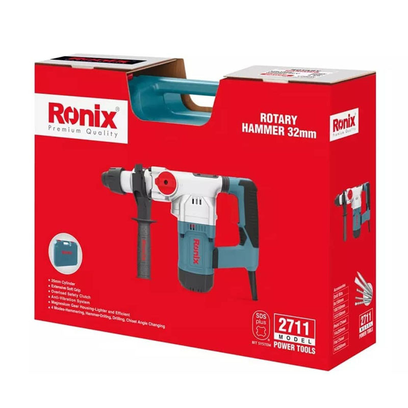 بتن کن 32 میلی متری رونیکس مدل 2711 مجهز به موتور قدرتمند 1200 واتی است که می تواند سرعتی بالغ بر 1050 دور و 4200 ضربه در دقیقه ایجاد کند. این دستگاه دارای ابزارگیر چهار شیار با ظرفیت 32 میلی متر است و امکان نفوذ مته تا عمق 32 میلی متر در بتن، 13 میلی متر در سطوح فلزی و 40 میلی متر در چوب را به وجود می آورد. از دیگر ویژگی های این بتن کن می توان به دکمه تغییر حالت برای اجرای 4 عملکرد سوراخ کاری، سوراخ کاری چکشی، تخریب و خلاص کن اشاره کرد. به علاوه 2711 رونیکس دارای بدنه ای مقاوم از جنس منیزیم است که باعث وزن متناسب و در نتیجه کاربری آسان شده است. مشخصه دیگر این دستگاه برخورداری از سیلندری با ظرفیت بالا برای ایجاد قوی ترین ضربه ها با توان 5 ژول جهت اثربخشی بیشتر دستگاه می باشد. در ضمن این ابزار برقی در یک کیف BMC مقاوم در برابر ضربه همراه با 3 مدل مته، 2 نوع قلم و یک دسته جانبی ارگونومیک عرضه می شود.