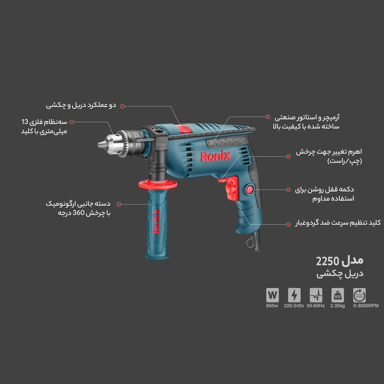 ویژگیهای دریل: سیستم گردش چپگرد , سیستم گردش راستگرد , قابلیت کنترل سرعت , قفل سوییچ , سیستم ضربه زن