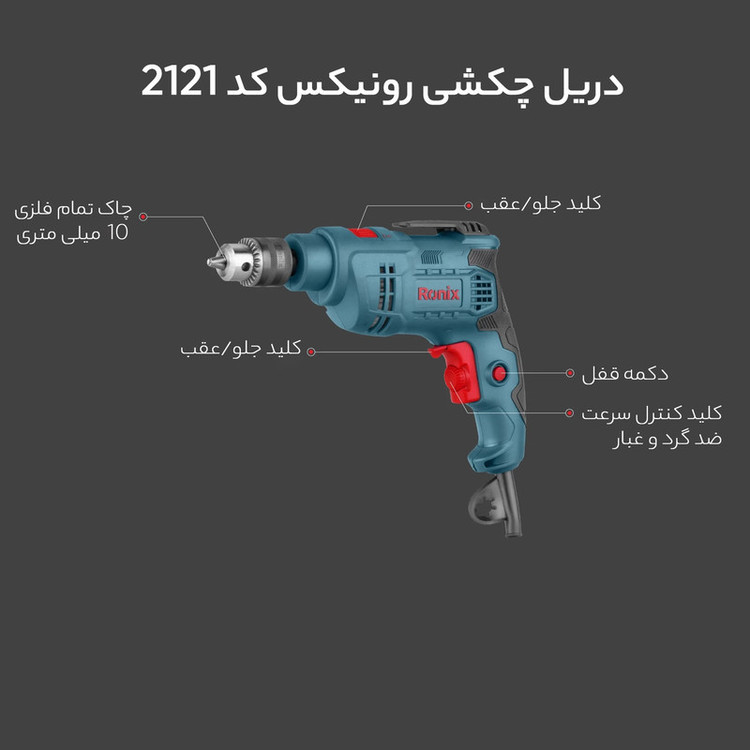 توانایی سوراخکاری به صورت چکشی حاوی گیره بدنه مورد کاربرد در ارتفاع دارای سه نظام آچاری 10 میلی متری مجهز به آرمیچر و بالشتک های صنعتی مطابق با استاندارد CE کلید دور متغیر با قابلیت راستگرد ، چپگرد و ضد غبار مطابق با استاندارد TUV