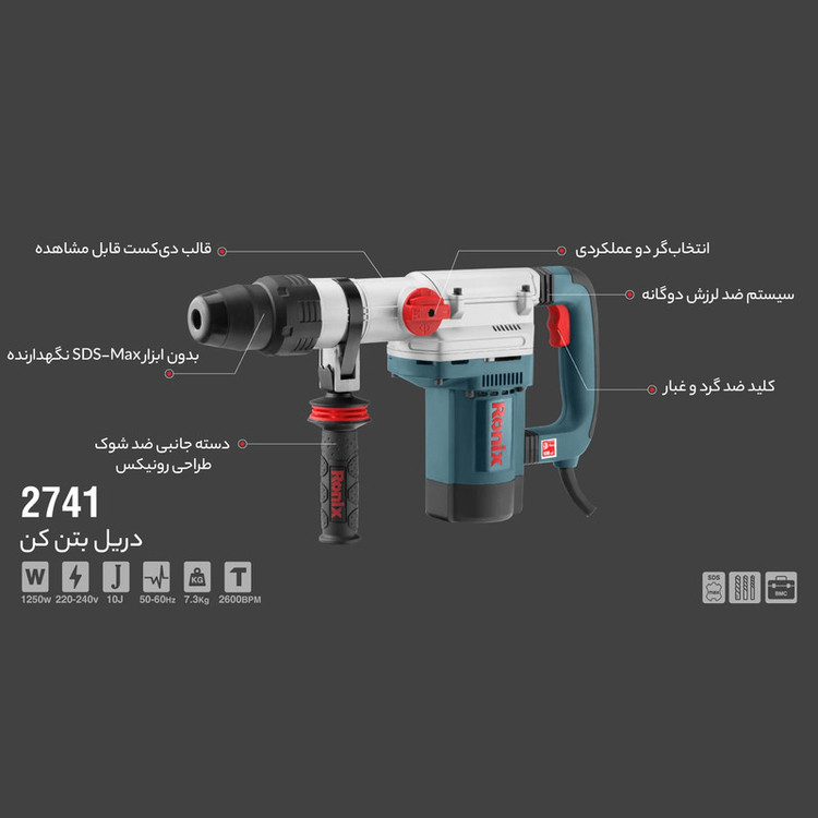 موتور پرقدرت 1250 وات با دو قابلیت سوراخکاری چکشی و سوراخکاری چکشی چرخشی و محفظه منیزیومی ریختهکری شده علاوه بر وزن سبک به خنکشدن دستگاه و افزایش توان آن کمک میکند و مجهز به دسته جانبی ارگونومیک 360 درجه که علاوه بر امکان انجام کار در دامنه وسیعی از زوایا و حالتهای مختلف راحتی کاربر را نیز فراهم میکند و سیستم ضد لرزش حرفهای باعث کاهش خستگی دست کاربر در حین انجام فعالیتهای سنگین میشود و سیستم دقیق دوران قلم به منظور افزایش دقت برای انجام کار روی موقعیت مدنظر و سیستم تخریب سریع با قدرت و کیفیت بالا که این دستگاه را به عنوان رقیب نمونههای مشابه خارجی معرفی میکند و دسته جانبی این دستگاه قدرت نگهداری بالایی را برای انجام کار در ساعتهای متوالی در اختیار کاربر قرار میدهد و سیستم کلاچ ایمنی قابلیت این را دارد که اضافه بار را کنترل کند و از این طربق از قسمت موتور دستگاه محافظت کرده و ایمنی را تضمین کند و قابلیت تنظیم و تثبیت سرعت توسط دیمر الکترونیکی به منظوراستفاده در کاربری های مختلف