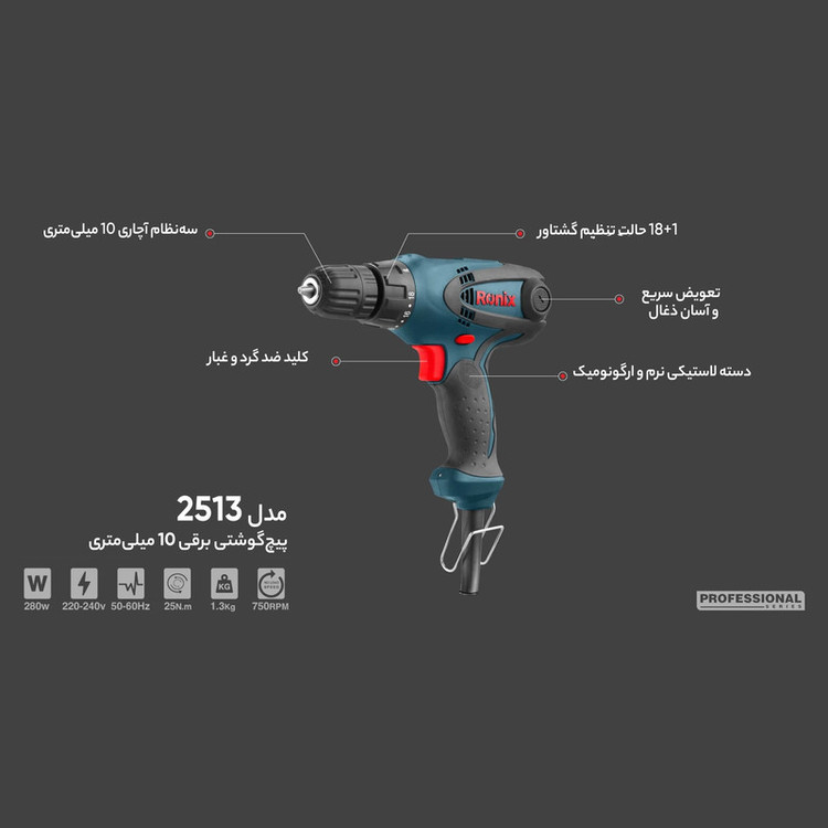 محصول فوق گیربکس دو سرعته، فلزی و مستحکم با عملکرد خارقالعاده در فعالیتهای سنگین صنعتی؛ قابلیت ایجاد سرعت برای کاربریهای مختلف با دقت بالا؛ سرعت در حالت آزاد در دو محدودهی صفر تا 440 دور در دقیقه و صفر تا 1650 دور در دقیقه میباشد . دارای بلبرینگ ضد غبار، با کیفیت و دوربالا ودارای 18 عدد تقسیمبندی و قابلیت تنظیمات 18 حالته برای گشتاور و سه نظام اتوماتیک؛ دو تکه؛ فلزی؛ 10 میلیمتری میباشد . طراحی ارگونومیک، سبکوزن و کمحجم، 1.3 کیلوگرمی؛ کاهش خستگی کاربر به خاطر طراحی دستگاه با سبکترین وزن و در عین حال، قدرت بسیار بالا؛ دارای روکش لاستیکی نرم، مقاوم به ضربه و سقوط احتمالی؛ دستهی ارگونومیک جهت سهولت کاربری ست . مجهز به کلیدهای ضد غبار جهت ممانعت از ورود گرد و غبار به داخل دستگاه؛ کلید گازی کنترل سرعت؛ کلید چپگرد راستگرد؛ کلید تنظیم سرعت در دو حالت میباشد .