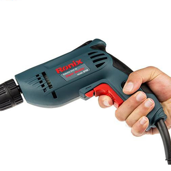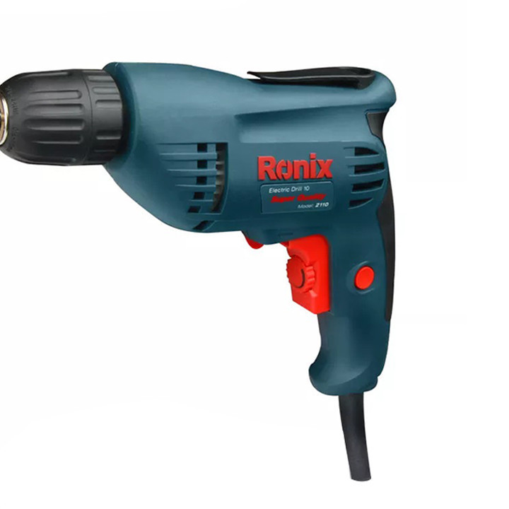 دریل برقی مدل 2110 یک دستگاه ساده، کوچک و مناسب برای استفاده در منزل یا محل کار است. این محصول با برند «رونیکس» (Ronix) تولید و به بازار عرضه میشود. 2110 به یک موتور تک سرعتی مجهز شده و قابلیت گردش به طرفین را دارد. برای این محصول یک سهنظام خودکار در نظر گرفتهاند و برای تعویض مته نیاز به استفاده از هیچ نوع ابزاری ندارید. این مدل را شرکت ایرانی رونیکس تولید میکند. این شرکت مدتی است که به ساخت و عرضهی ابزارهای مختلف اشتغال دارد. موتور در نظر گرفتهشده برای مدل 2110، با قدرت 400 وات عمل میکند. سرعت گردش این دریل تا 2900 دوربردقیقه میرسد. این سرعت گردش با استفاده از پیچ قرارگرفته روی شستی تنظیم میشود. علاوه بر این جهت گردش دریل هم بهصورت راستگرد و هم بهصورت چپگرد، امکانپذیر است. از این دستگاه برای سوراخکاری اجسام و قطعات مختلف چوبی یا فلزی استفاده میکنند. حداکثر قطر سوراخکاری این دستگاه در چوب و فلز به ترتیب 25 و 10 میلیمتر است. ویژگی این دستگاه استفاده از سهنظام خودکار در تولید این محصول است؛ بهعبارتدیگر برای تعویض مته، نیازی به استفاده از آچار ندارید. همچنین یک گیره پلاستیکی روی دستگاه قرارگرفته که از آن برای اتصال دستگاه به کمربند استفاده میکنند. این دستگاه 1.5 کیلوگرم وزن دارد. با توجه به افزایش اشتیاق افراد جامعه به انجام خودکفای کارهای فنی منزل و محل کار، تهیهی ابزارهای موردنیاز برای این موضوع هم به تنوع بسیار زیادی انجام میشود. ازجملهی ابزارهایی که امروزه در منازل و مغازههای مختلف میبینیم، دریل برقی یا شارژی است. این دستگاه برای سوراخکاری اجسام مختلف به کار میرود. دریل برقی مدل 2110 رونیکس یک دریل برقی ساده با قدرت 400 وات است که سرعت آن حداکثر تا 2900 دوربردقیقه تنظیم میشود.